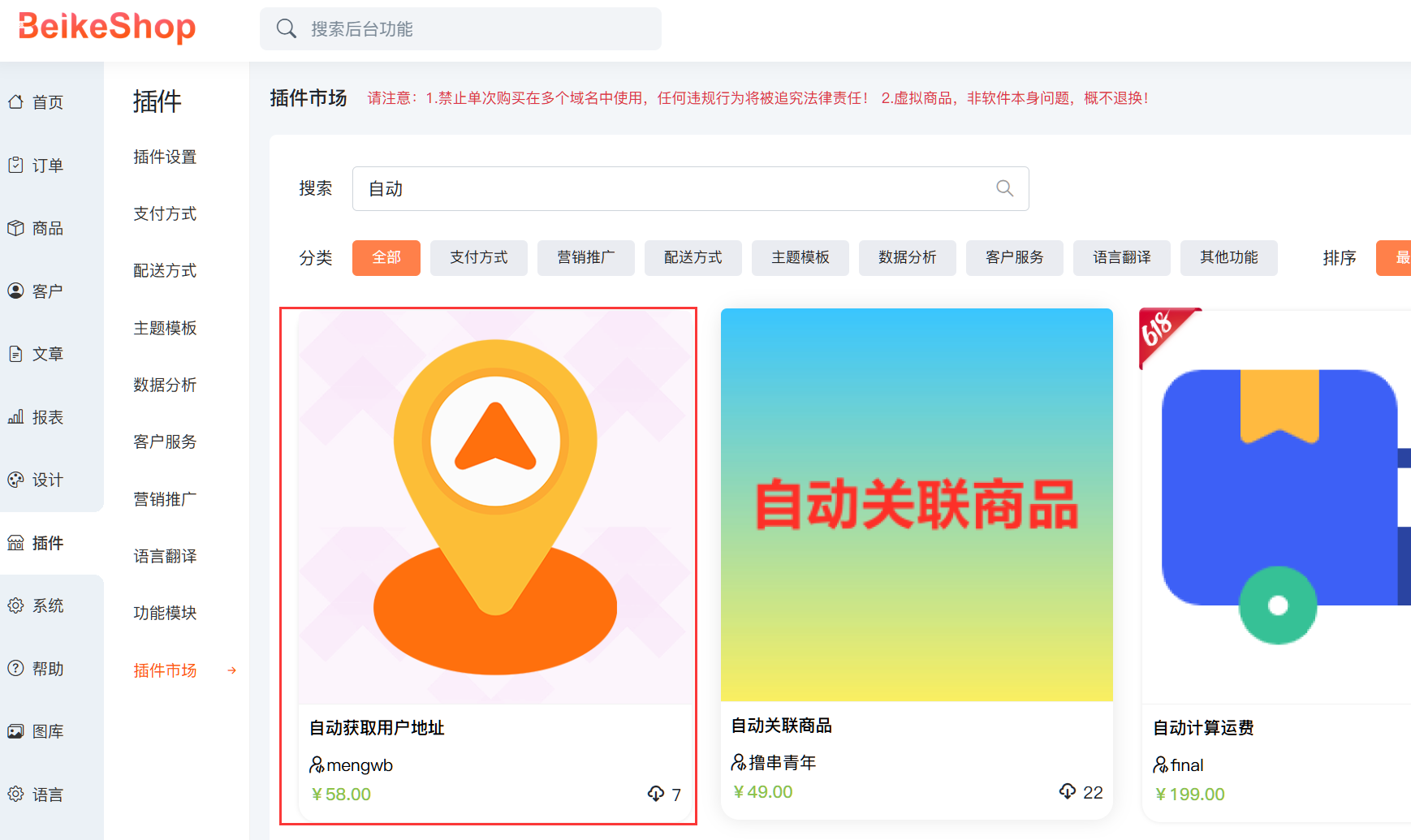 1. 登录 BeikeShop 后台 → 插件市场 → 搜索“自动获取用户地址”并购买插件;
