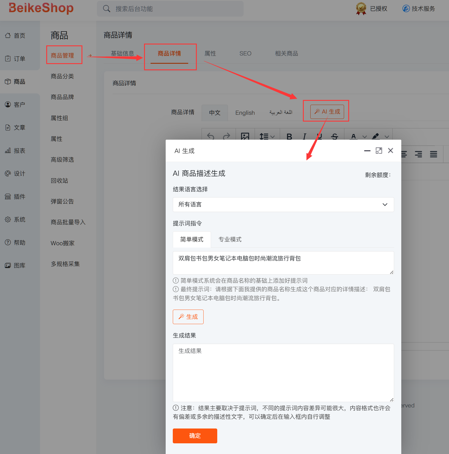快速生成独立站内容必备 - BeikeShop AI自动生成商品描述/图片插件