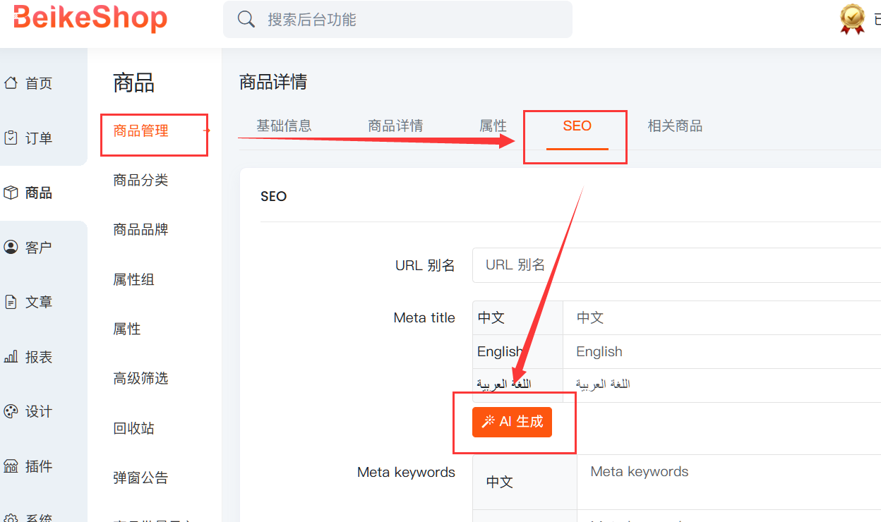 进入“商品管理-编辑-SEO”页面,点击“AI生成”按钮。
