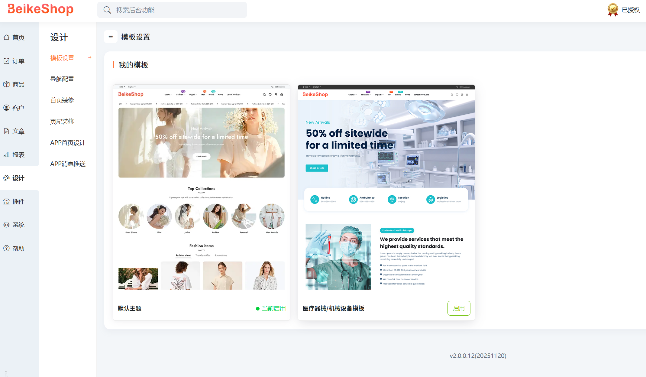 设计 → 模板设置 → 选择模板 → 启用