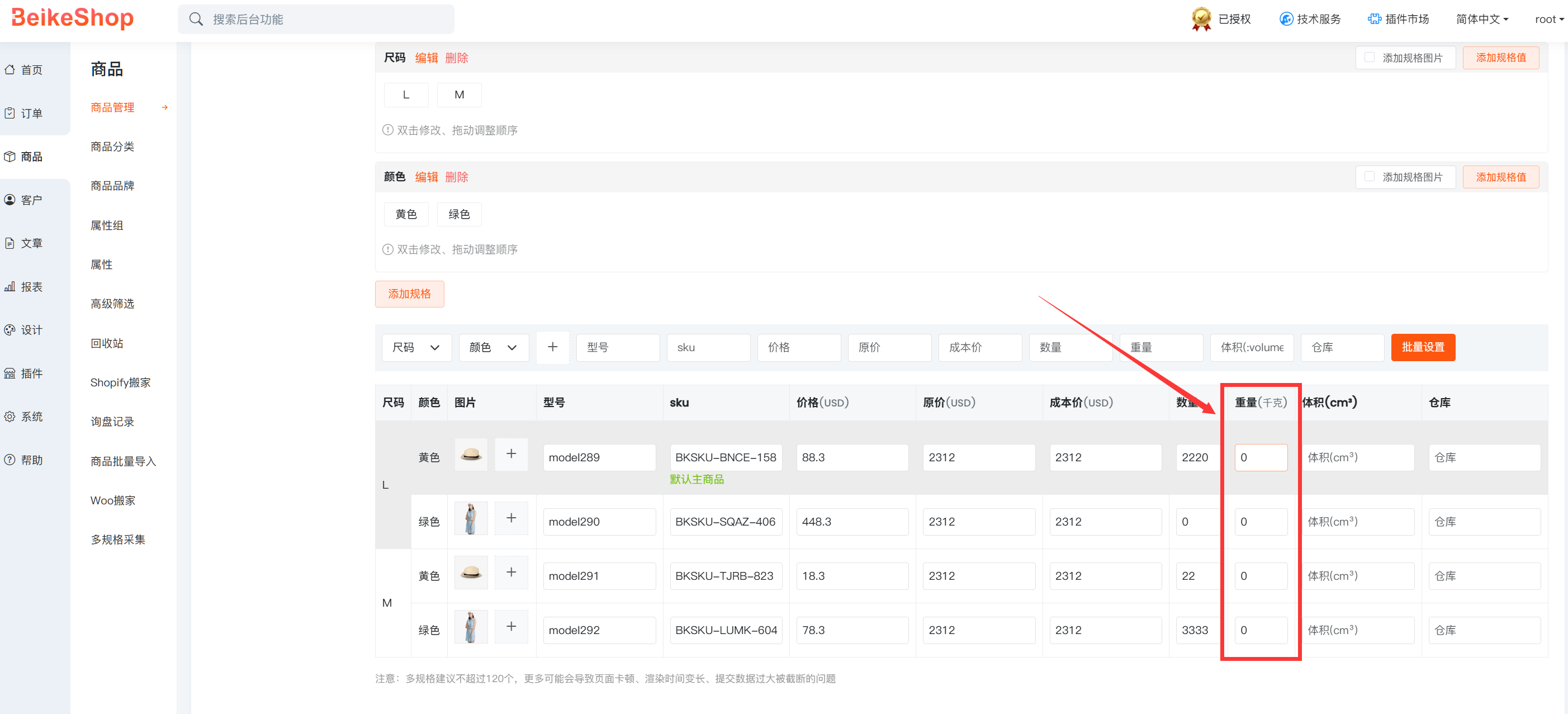 1. 多规格商品 SKU 新增重量设置,商品信息维度更丰富、更精准。