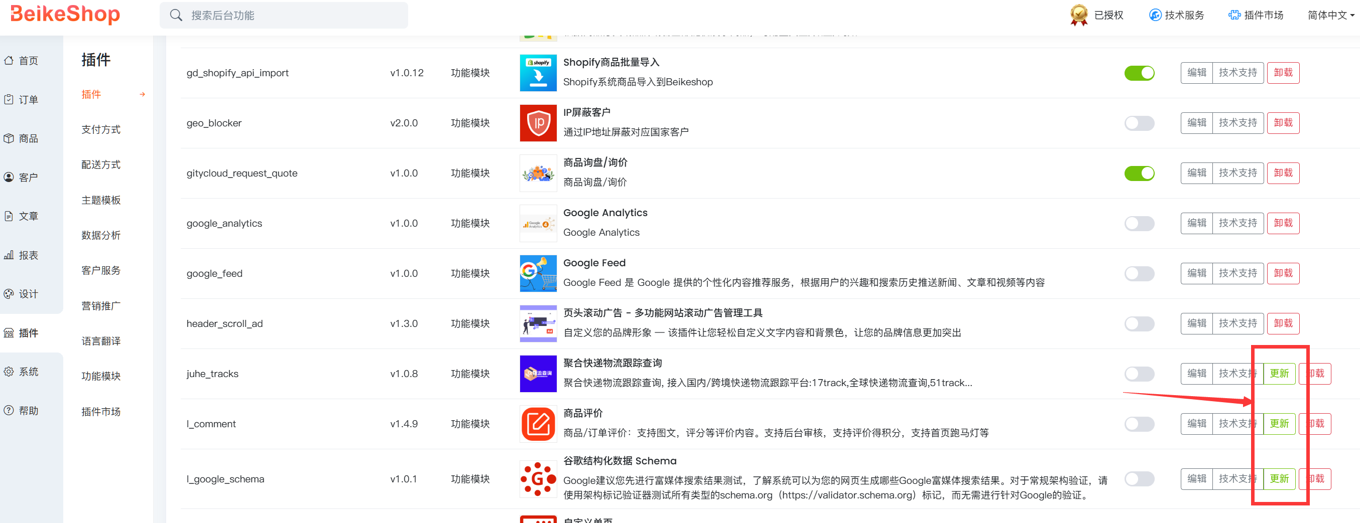 1. 后台插件列表支持一键更新插件,升级插件更轻松。