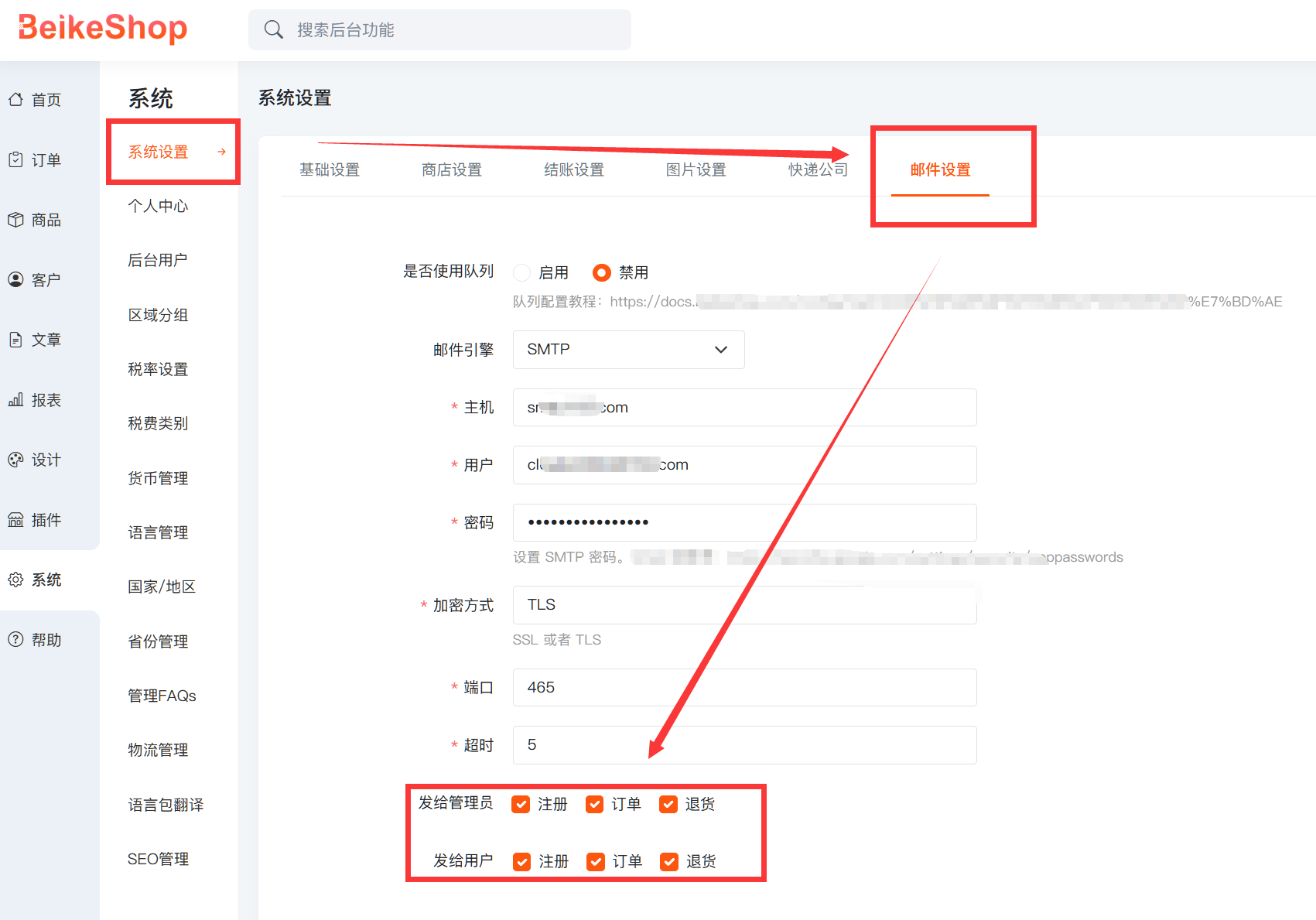 可选择在用户注册、产生订单、退换货时,系统是否会发送提醒邮件给消费者和管理员。